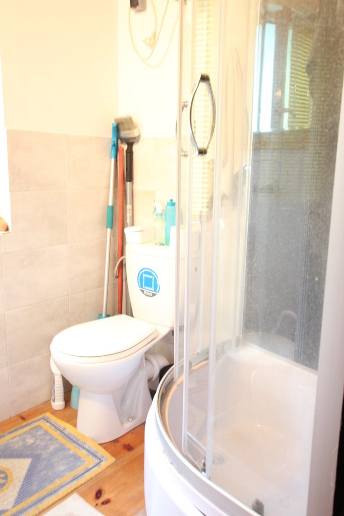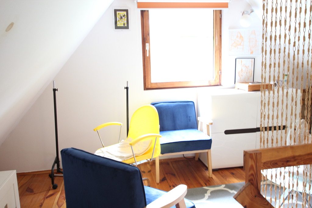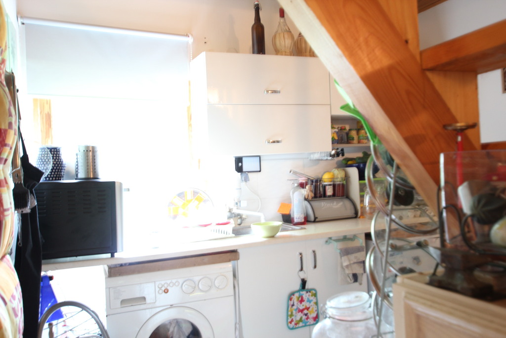 Na parterze domku znajdują się salon z aneksem kuchennym, łazienka z toaletą oraz drewniane schody prowadzące na poddasze gdzie jest sypialnia oraz niewielki gabinet.