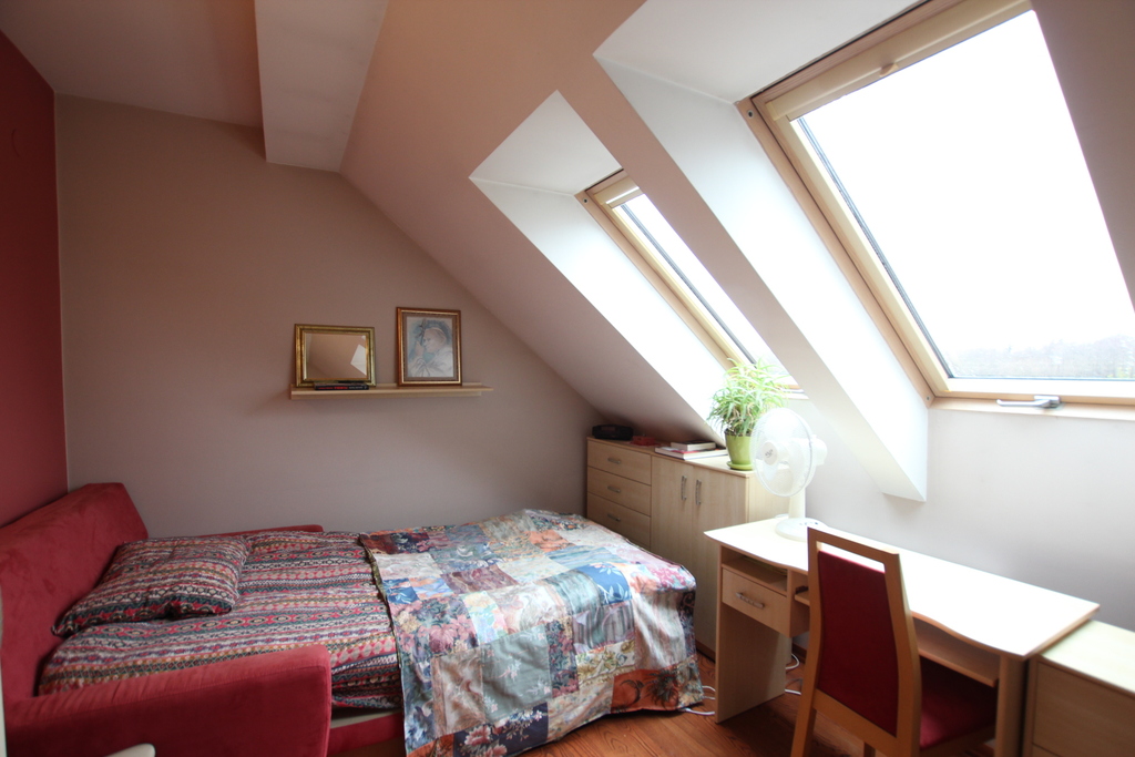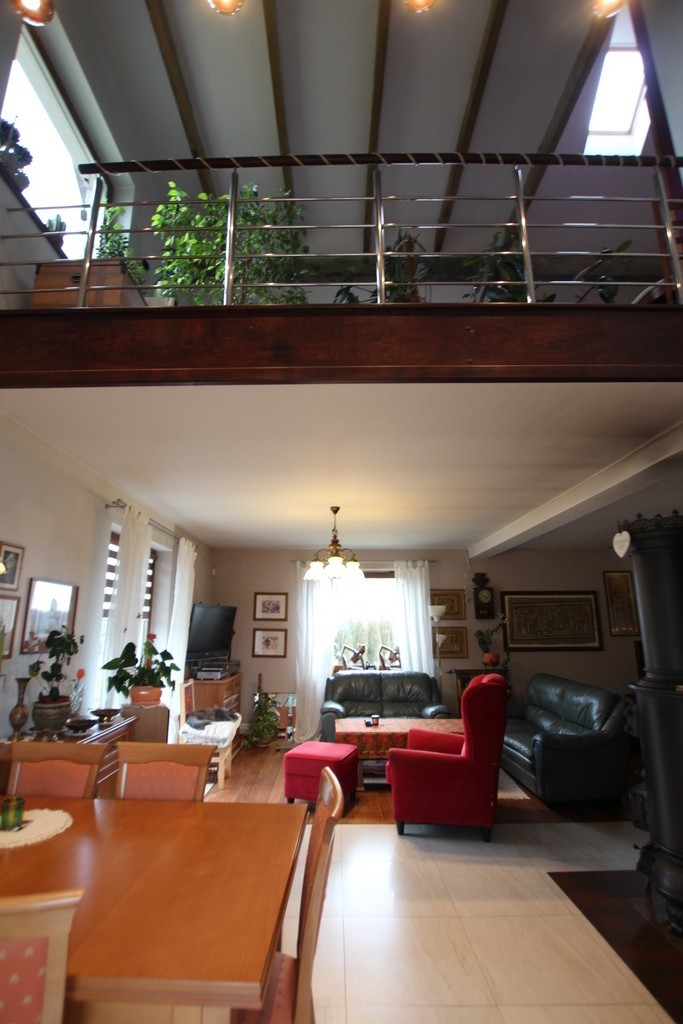 Na poddaszu znajdują się dwie sypialnie, pokój rekreacyjny, antresola, garderoba z oknem, łazienka (prysznic).