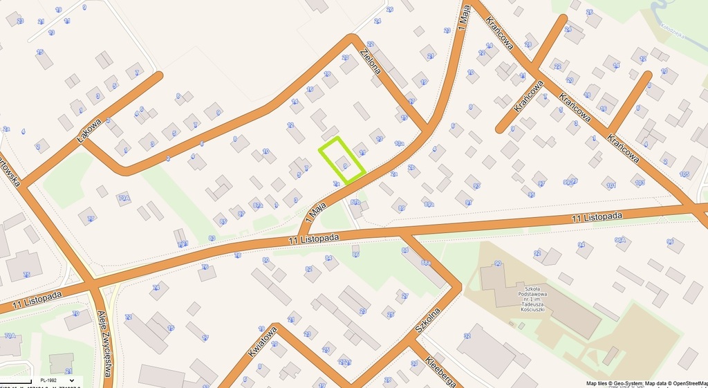 Powierzchnia działki wynosi 759 m2 (tj. 7,59 ara), a jej wymiarach to 18 metrów szerokości, wzdłuż ulicy na 41 metrów długości.