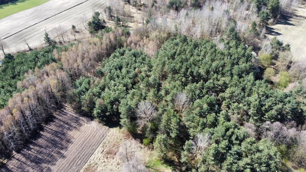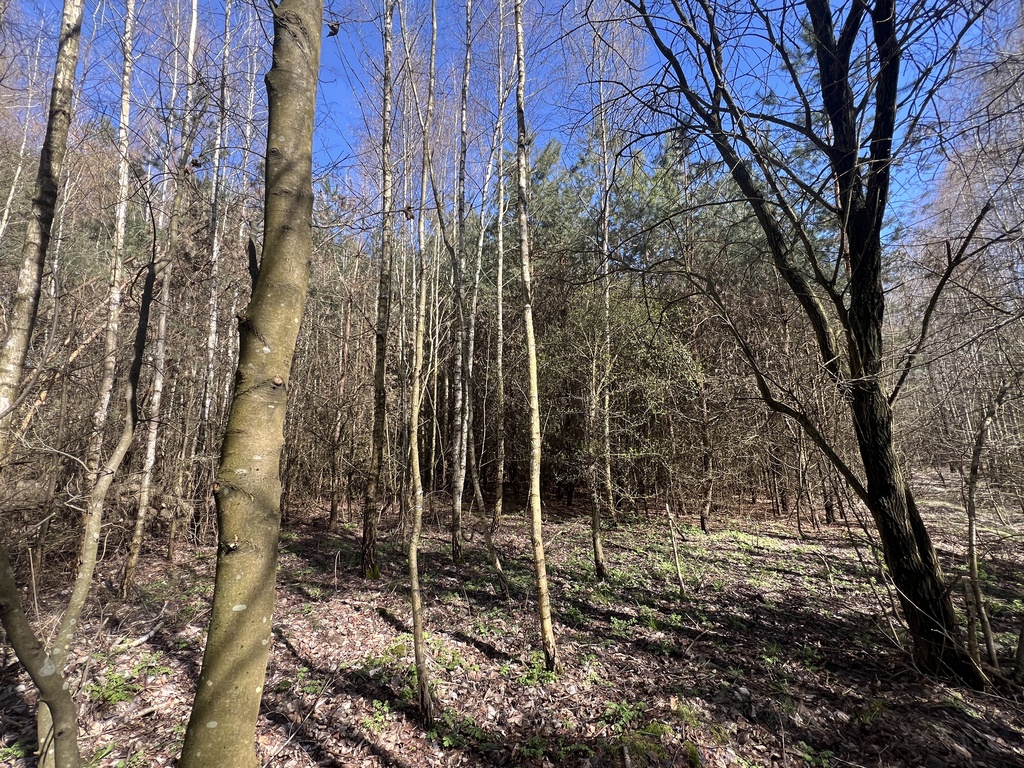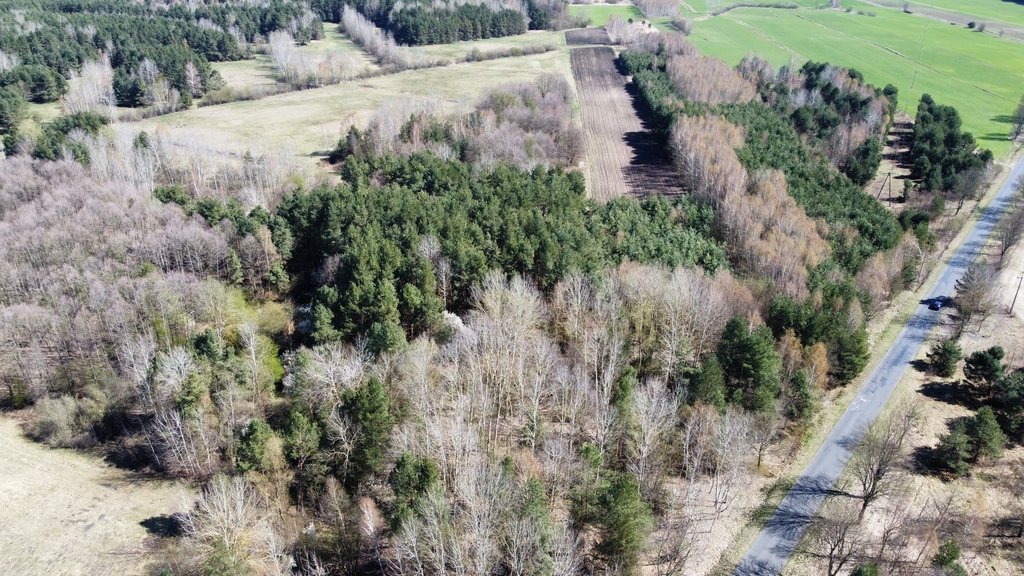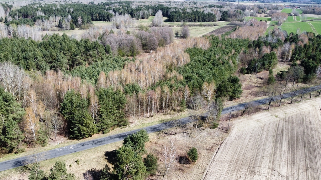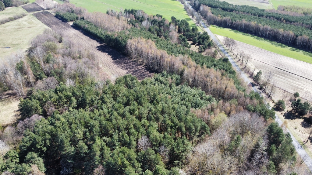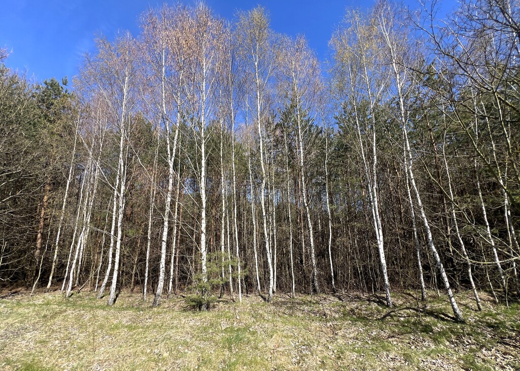 Powierzchnia działki porośnięta drzewami, głównie sosna i brzoza w wieku od 20-40 lat.