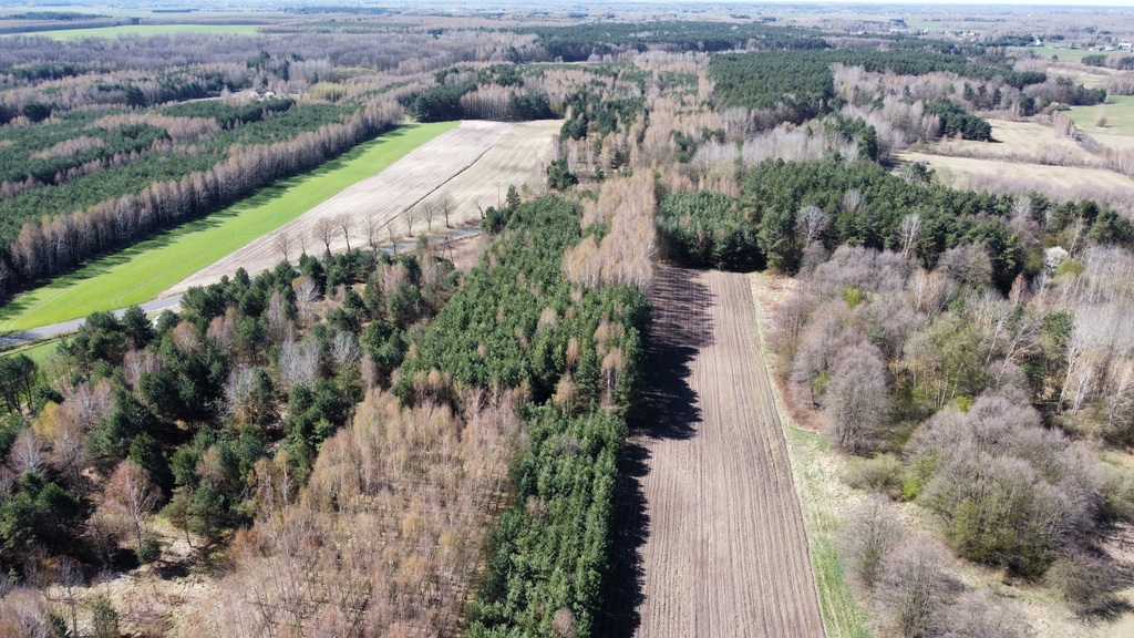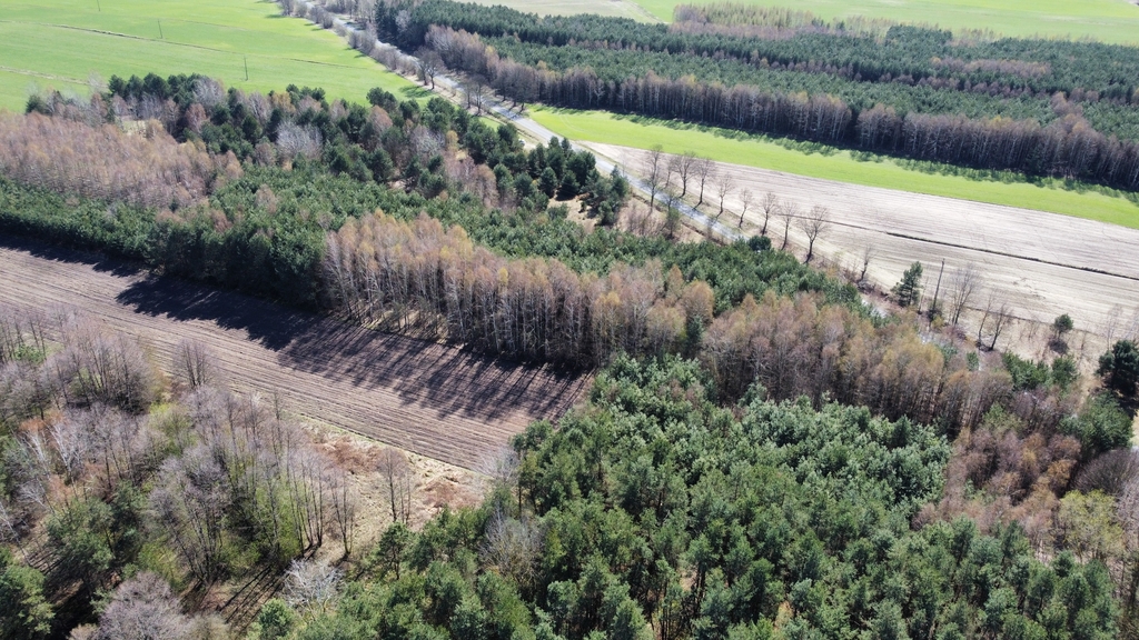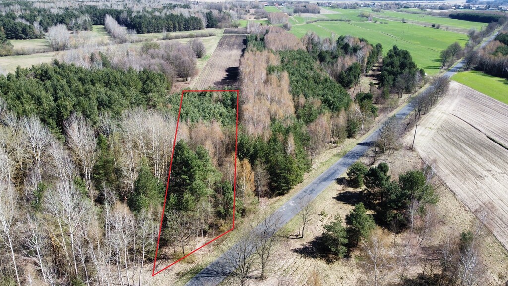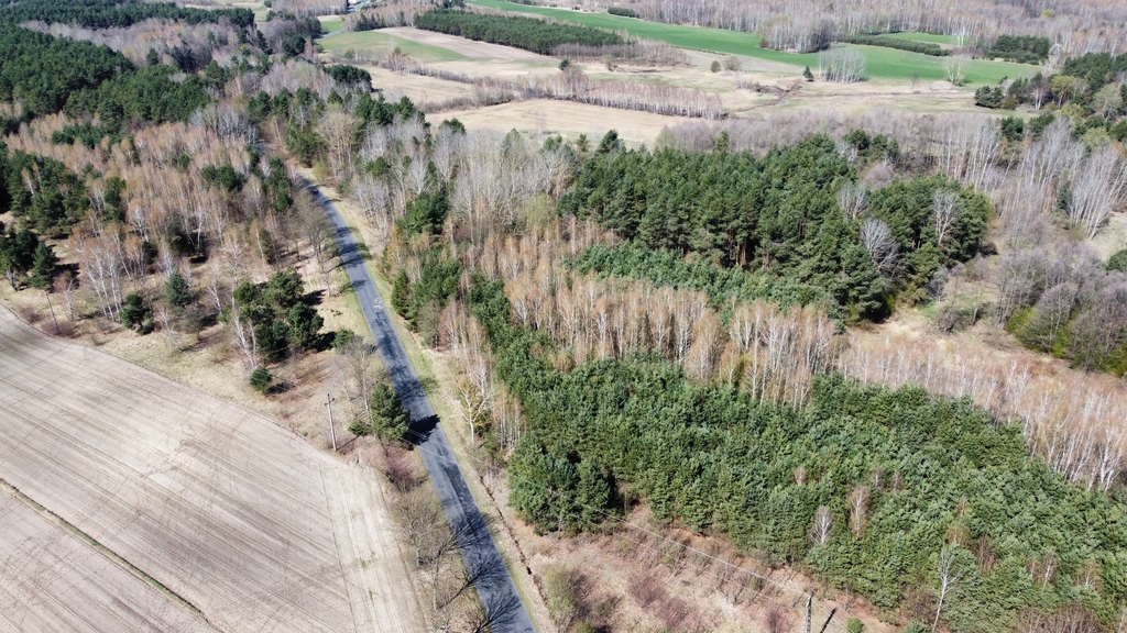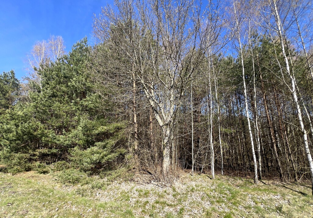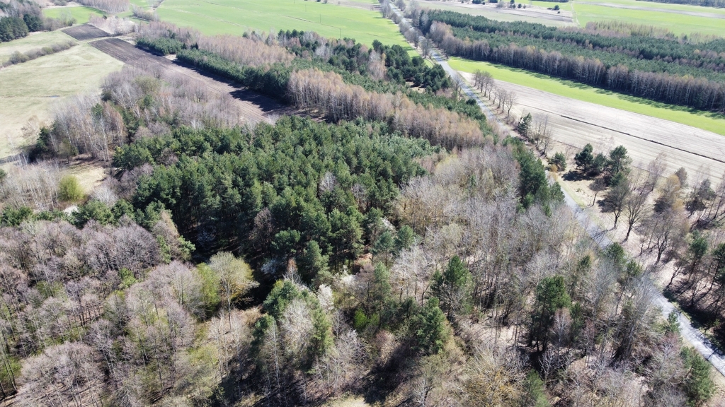 Powierzchnia działki porośnięta drzewami, głównie sosna i brzoza w wieku od 20-40 lat.