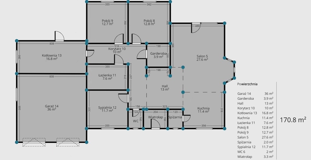 w tym powierzchnia użytkowa na parterze to 170,80 m2 i powierzchnia, do adaptacji, użytkowa poddasza 61,95 m2.
