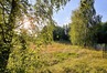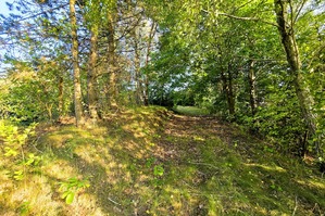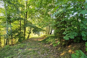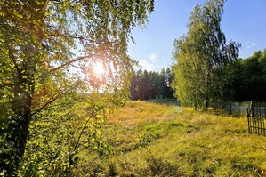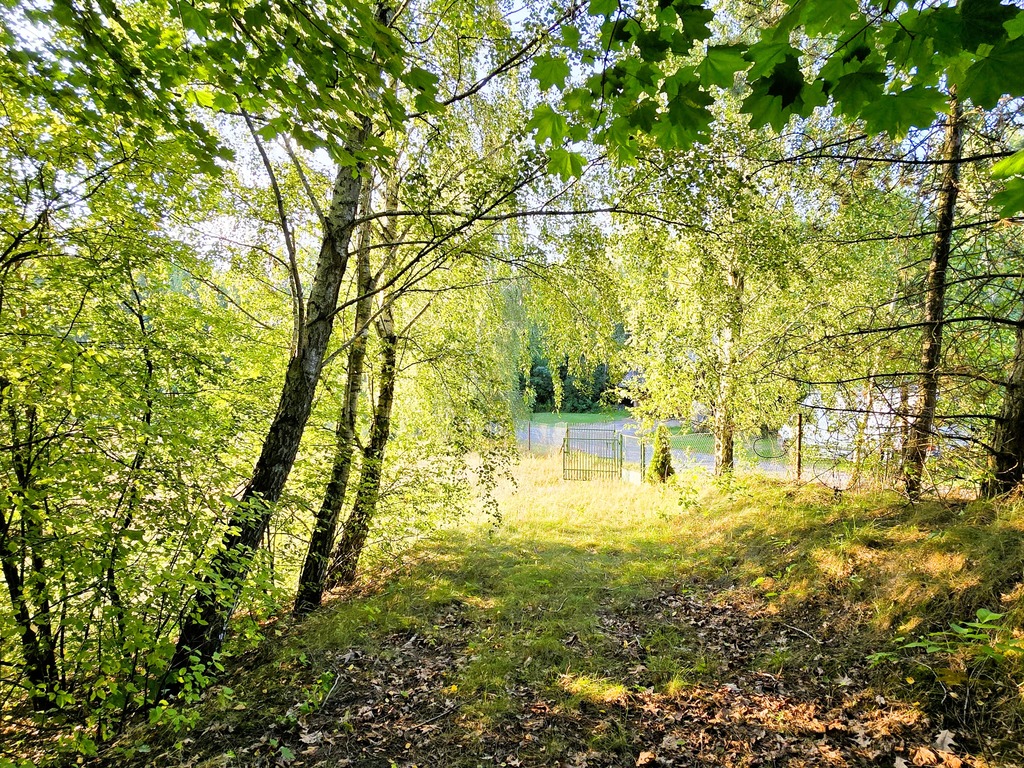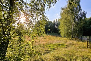 Teren lekko pochylony, ogrodzony, porośnięty drzewami i samosiejkami.