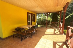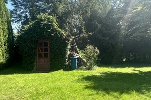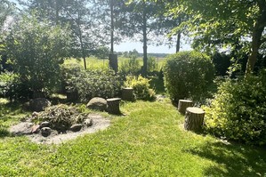 Wokół domu znajdziemy liczne nasadzenia drzew i krzewów, a w ogrodzie znajdziemy piwniczkę ziemną.