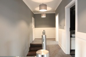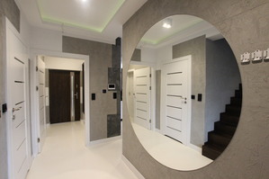 Podłogi na parterze i w podpiwniczeniu żywica epoksydowa, deska i gres, na piętrze wykładzina dywanowa i gres, schody drewniane jesionowe.