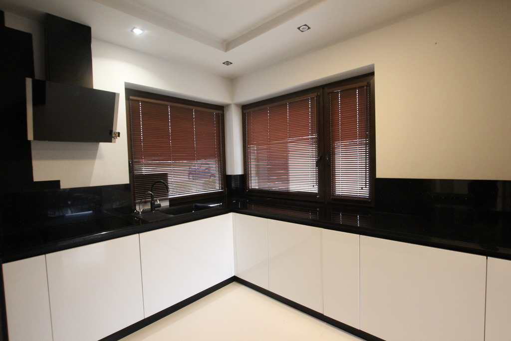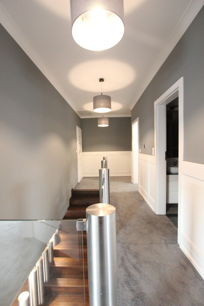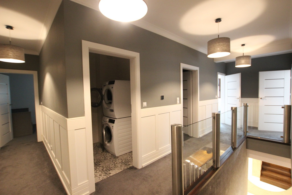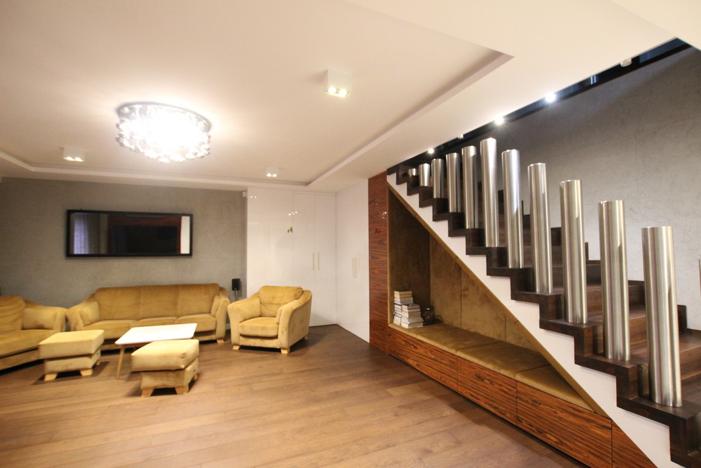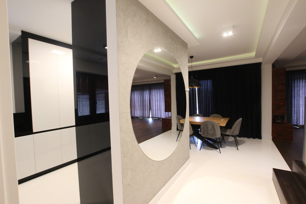 Podłogi na parterze i w podpiwniczeniu żywica epoksydowa, deska i gres, na piętrze wykładzina dywanowa i gres, schody drewniane jesionowe.