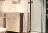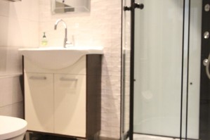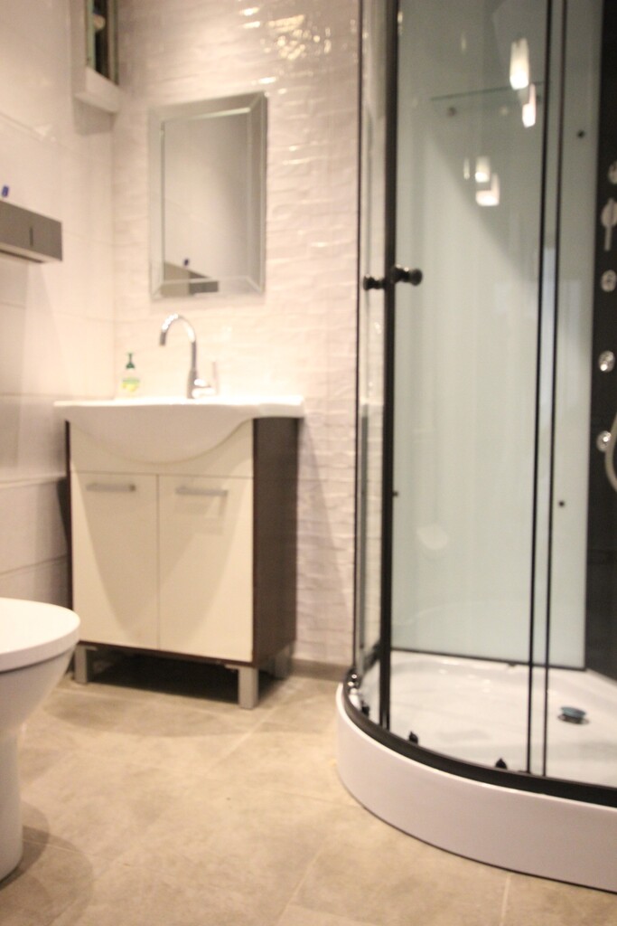 Na podłogach położone zostały panele w łazience terakota, glazura.