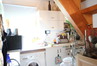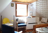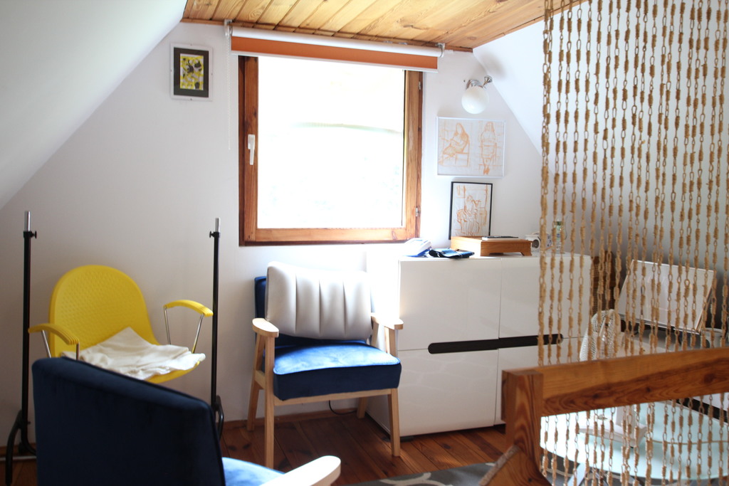 Na parterze domku znajdują się salon z aneksem kuchennym, łazienka z toaletą oraz drewniane schody prowadzące na poddasze gdzie jest sypialnia oraz niewielki gabinet.