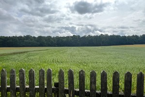 Siedlisko ogrodzone płotem metalowym i drewnianym.
