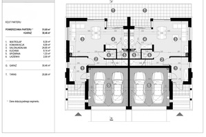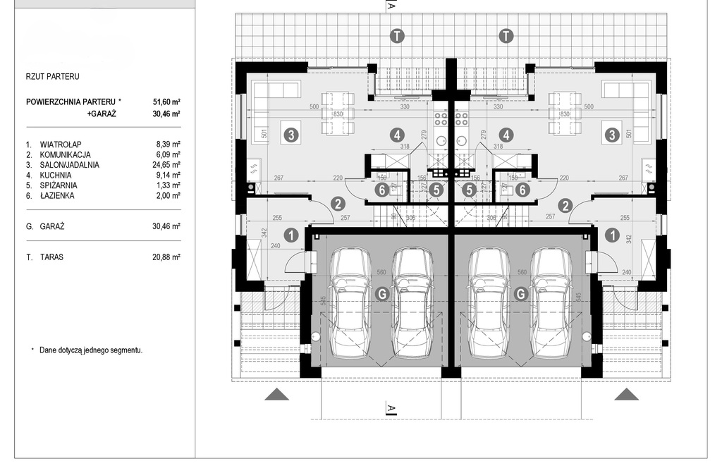 parter - wiatrołap (8,39m2), hol (6,09 m2), kuchnia (9,14 m2), salon z jadalnią (24,65 m2), spiżarnia (1,33 m2), łazienka (2,00 m2), garaż dwustanowiskowy (30,46 m2),