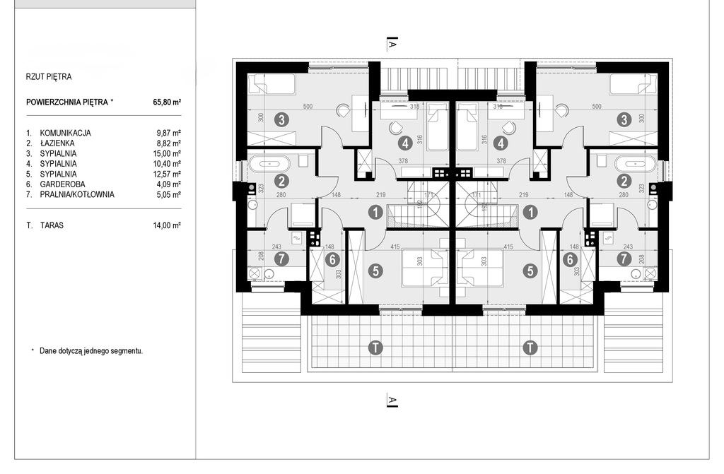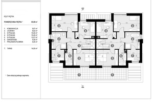 piętro - hol 9,87 m2), łazienka (8,82 m2), garderoba (4,09 m2), pokój (15,00 m2), pokój (10,40 m2), pokój (12,57 m2), pralnia z kotłownią (5,05 m2)