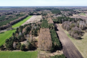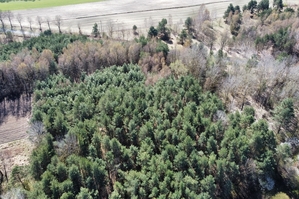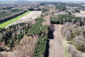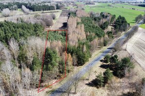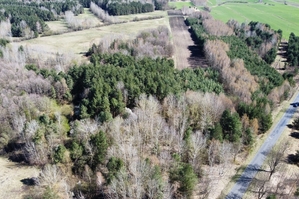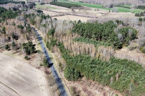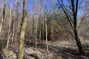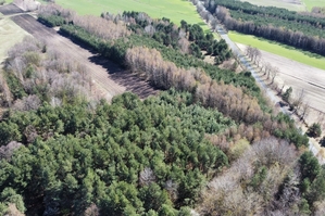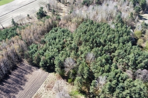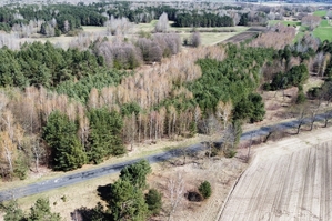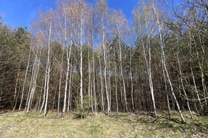 Powierzchnia działki porośnięta drzewami, głównie sosna i brzoza w wieku od 20-40 lat.