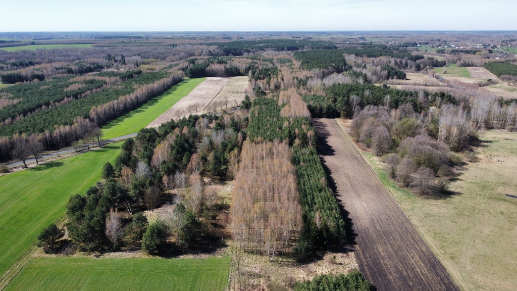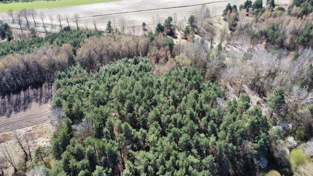 Powierzchnia działki porośnięta drzewami, głównie sosna i brzoza w wieku od 20-40 lat.