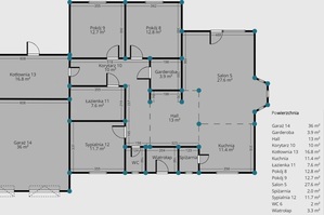 W skład domu wchodzą, na poziomie parteru kuchnia, salon, hall, spiżarnia, wiatrołap, sypialnia, WC, łazienka z WC, korytarz, dwa pokoje, garderoba, kotłownia i podwójny garaż z dwiema bramami wjazdowymi.
