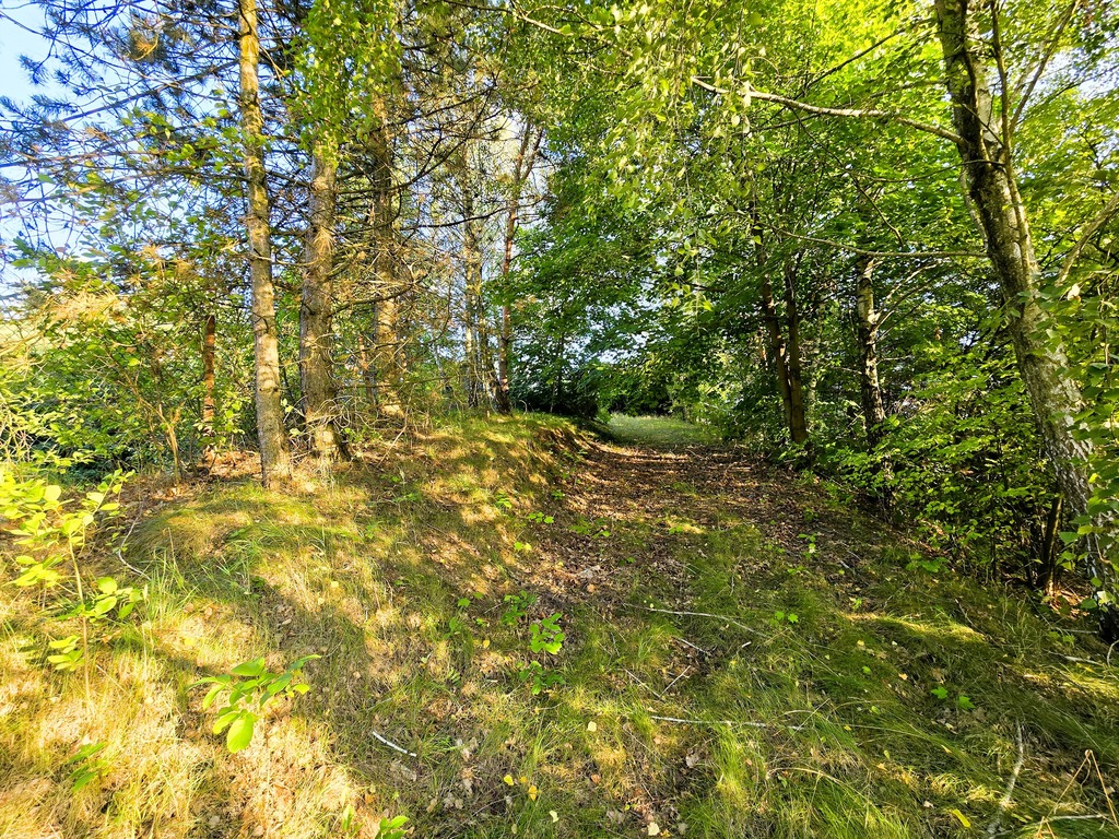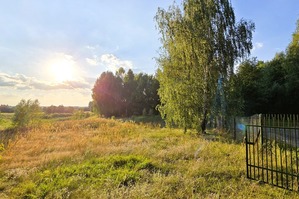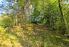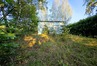 Teren lekko pochylony, ogrodzony, porośnięty drzewami i samosiejkami.
