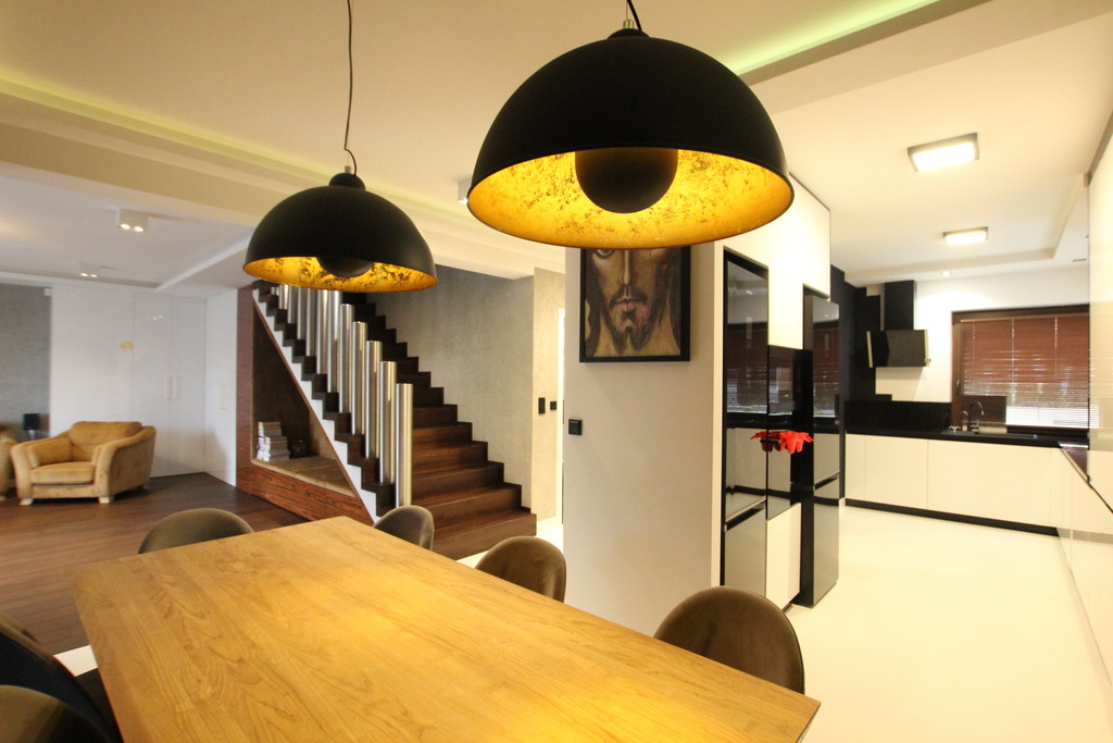 Podłogi na parterze i w podpiwniczeniu żywica epoksydowa, deska i gres, na piętrze wykładzina dywanowa i gres, schody drewniane jesionowe.