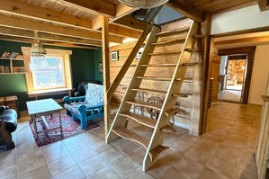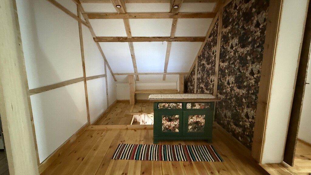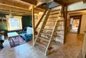 W szopie antresola drewniana z przygotowanym miejscem pod spanie na sianie.