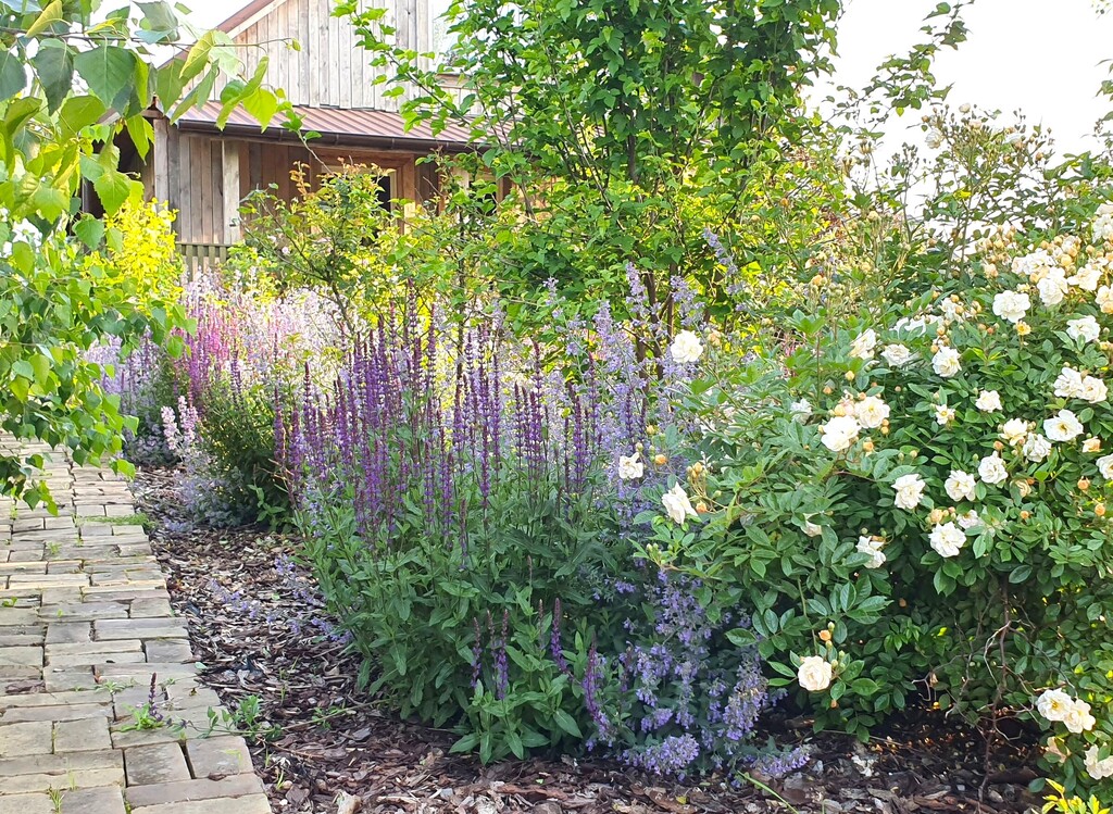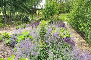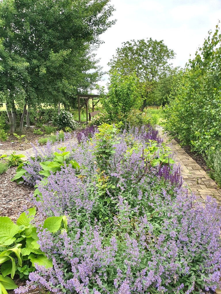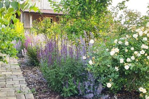 Ogród z rozprowadzeniem wody, z bogatymi, młodymi nasadzeniami, zadbany, ze ścieżkami wykonanymi ze starej brukowej klinkierowej cegły.