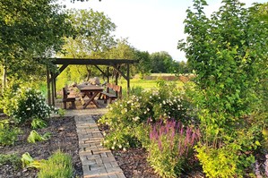 Przygotowane drewniane ławy wokół ogniska. Na granicy ogrodu i sadu drewniana altana. W sadzie stare odmiany jabłoni i olbrzymi orzech włoski.