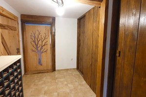 - Korytarz (9,20 m2) łączący kuchnię z pokojem wypoczynkowym wraz z drewnianą zabudową.