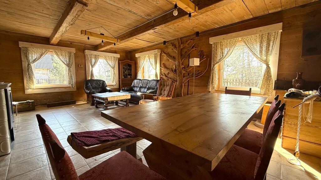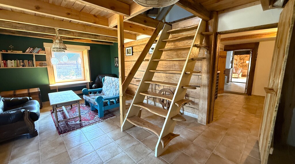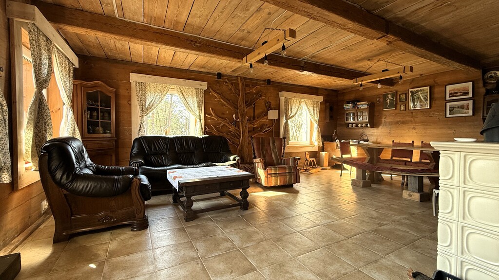 reszta ścian z ekspozycją doskonale zachowanych ponad 100-letnie bali sosnowych tworzących unikalny klimat domu.