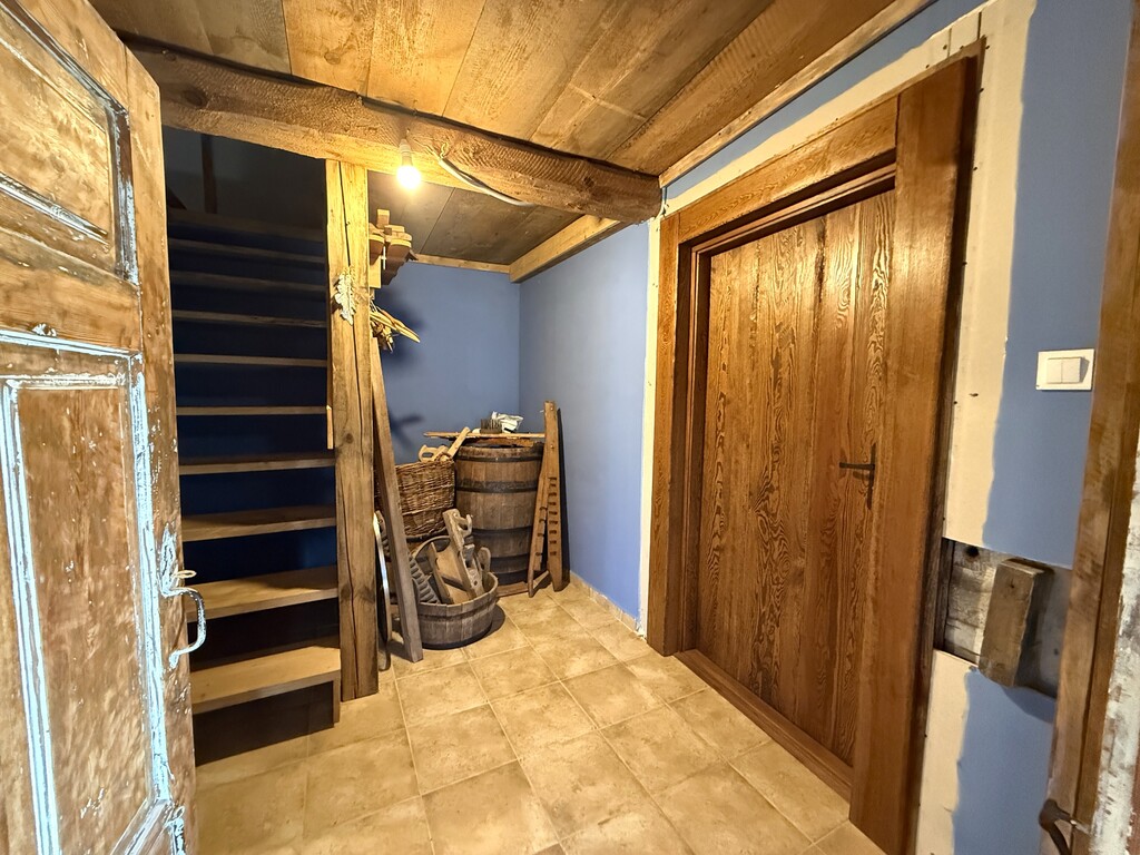 - Ganek, sień (8,40 m2) ze schodami na poddasze i z zejściem do małej piwniczki.