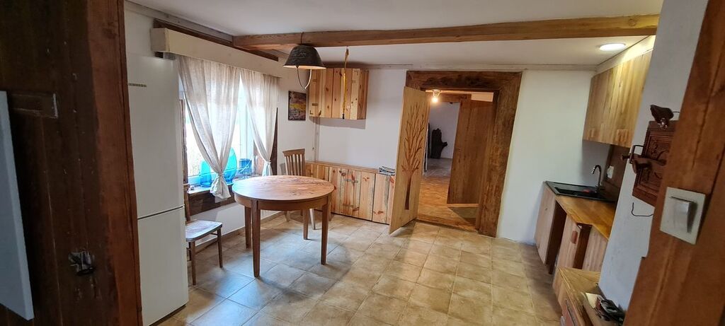 - Widna kuchnia (13,30 m2), zabudowana drewnianymi meblami.